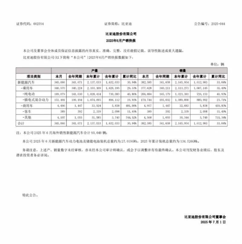 7月1日,比亚迪公布了今年6月销量数据,共销售38.25万辆,同比增长12%;乘用车及皮卡海外销售89699辆,同比增长229.8%。上半年累计销量已达214.59万辆,同比增长33%;乘用车及皮卡海外累计销量达47.01万辆。