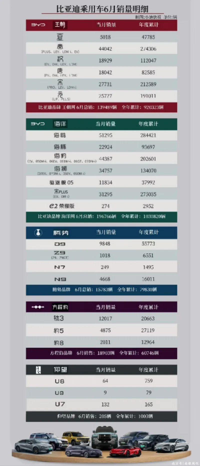 从车型来看,海洋系列的海鸥6月销量高达51295辆,以其超高性价比和时尚外观,成为小型电动车市场的明星产品,上半年累计销量达到284421辆。王朝系列中,秦6月销量44042辆,年度累计274306辆;汉6月销量18929辆,年度累计112047辆,在中大型轿车市场竞争激烈的情况下,销量依然稳健。