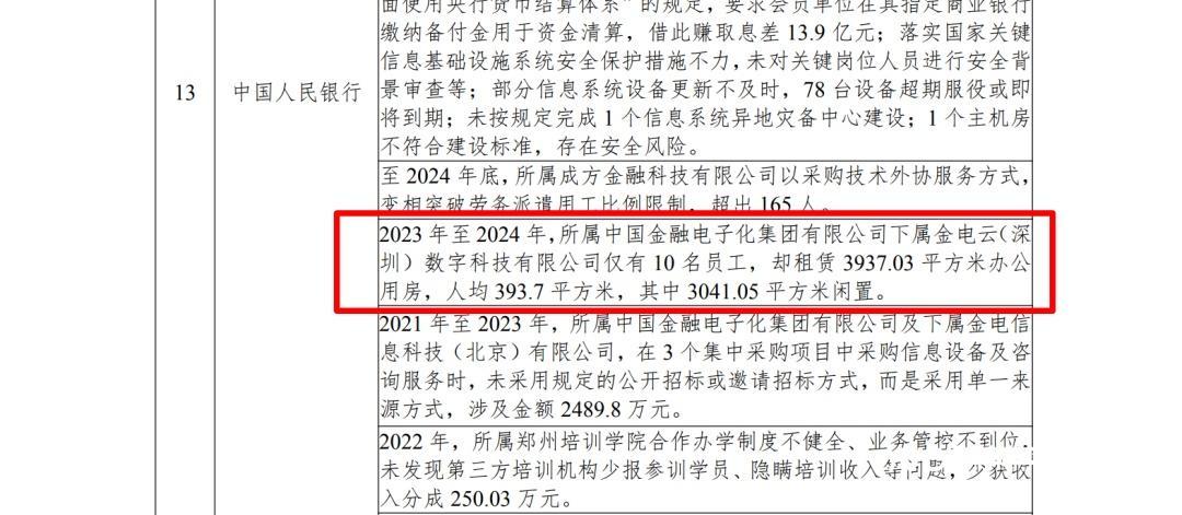 近日,审计署发布2025年第1号公告:《中央部门单位2024年度预算执行等情况审计结果》。公告披露,中国人民银行旗下金电云(深圳)数字科技有限公司办公用房严重超标,这家仅有10名员工的公司却租用了3937.03平方米的办公用房,人均393.7平方米,其中3041.05平方米闲置。
