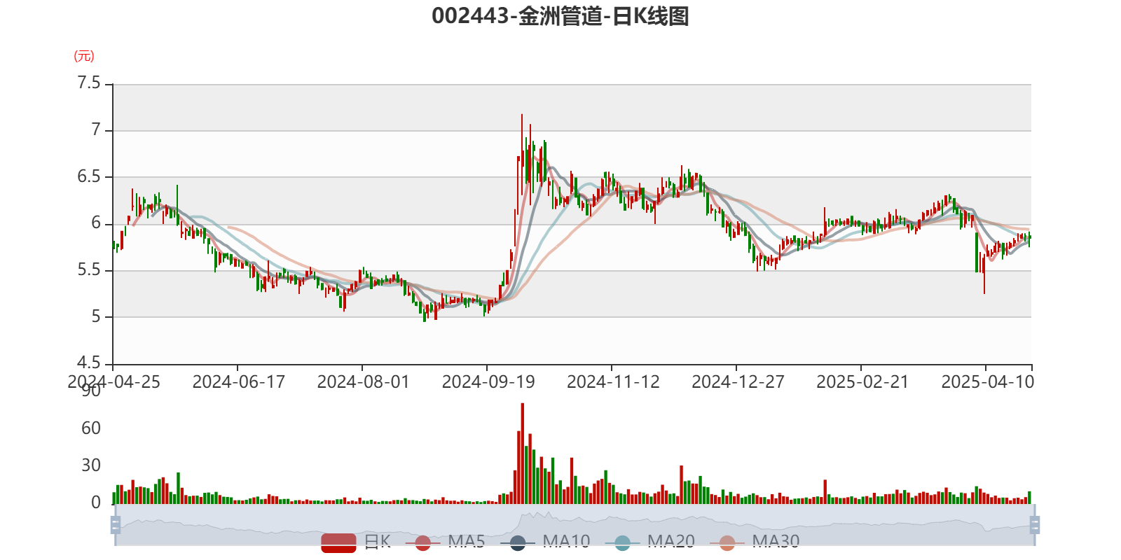 股东名称持流通股数(万股)占总股本比例(%)变动比例(百分点)上海金洲智慧企业发展集团有限公司11055.9321.239527不变高志平541.741.040736-0.009阿斯顿(上海)信息科技合伙企业(有限合伙)476.990.91634新进张权388.880.7470770.108新华资产管理(香港)有限公司-Mountain Top Limited3610.693517新进迈隆2号私募证券投资基金277.70.533489新进周菊芳267.330.513567新进富国稳健增强债券型证券投资基金263.140.505518新进杭州贝腾科技有限公司2610.501407新进李亚玲254.670.489246新进值得注意的是,中登公司数据显示,截至2025年4月18日,金洲管道10.57%股份处于质押状态。年报显示,第一大股东上海金洲智慧企业发展集团有限公司质押5500万股公司股份,占其全部持股的49.75%。