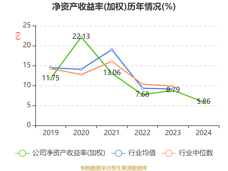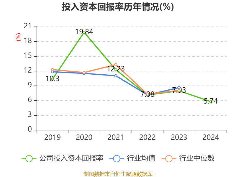 数据显示,2024年公司加权平均净资产收益率为5.86%,较上年同期下降2.93个百分点。公司2024年投入资本回报率为5.74%,较上年同期下降2.19个百分点。