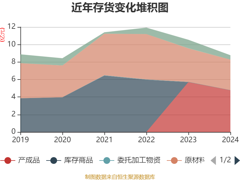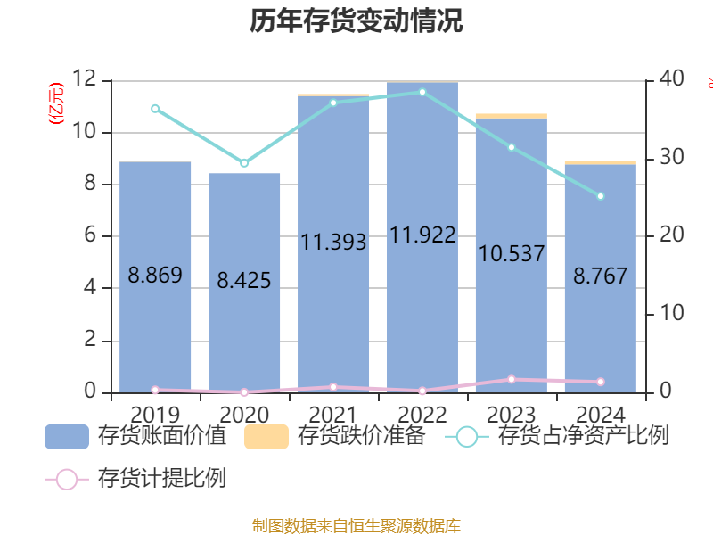从存货变动来看,截至2024年末,公司存货账面价值为8.77亿元,占净资产的25.14%神牛资讯,较上年末减少1.77亿元。其中,存货跌价准备为1200.33万元,计提比例为1.35%。